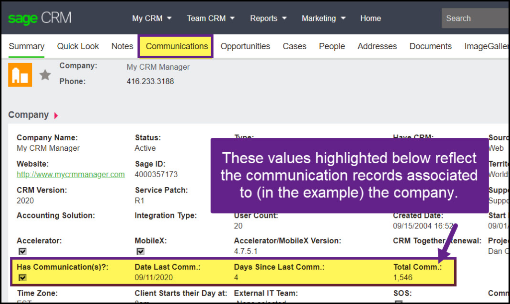 This image shows fields on the Company summary screen that reflects data from the communications tab. And the information collected is often used in reports and dashboards. For example in certain reports that display in our User Activity Dashboard.